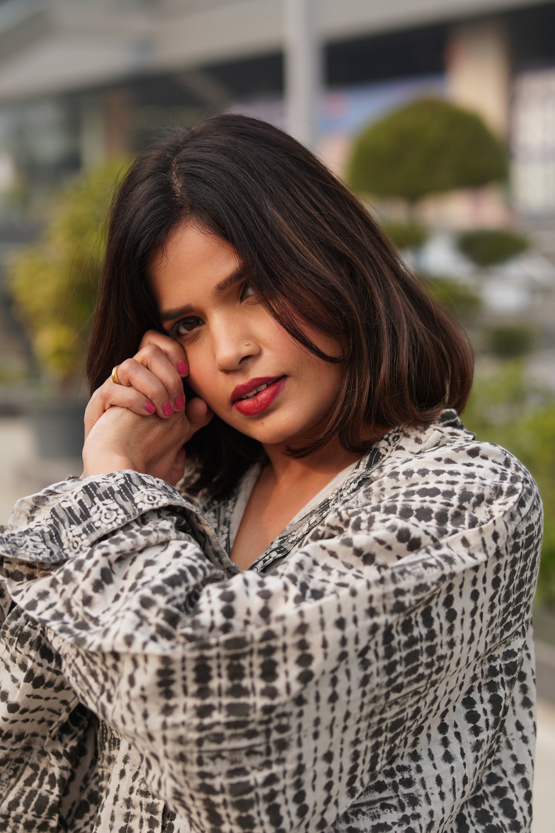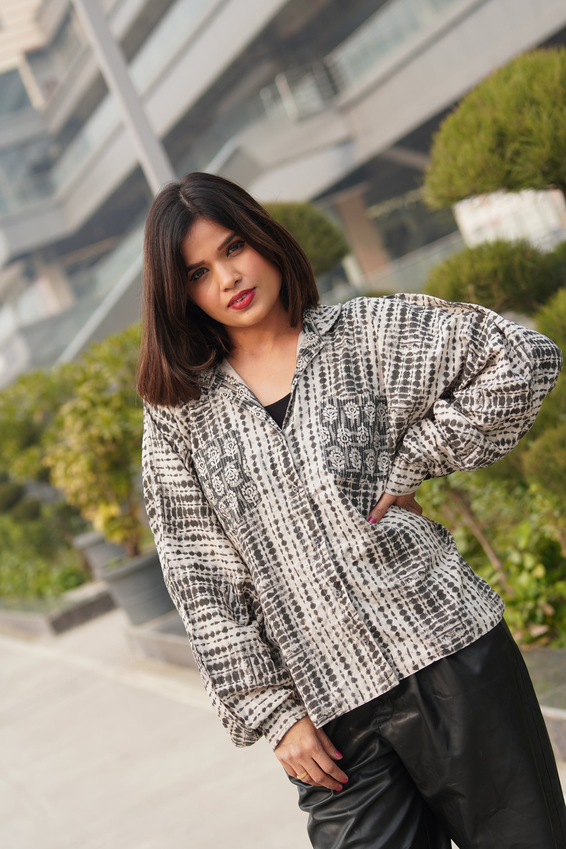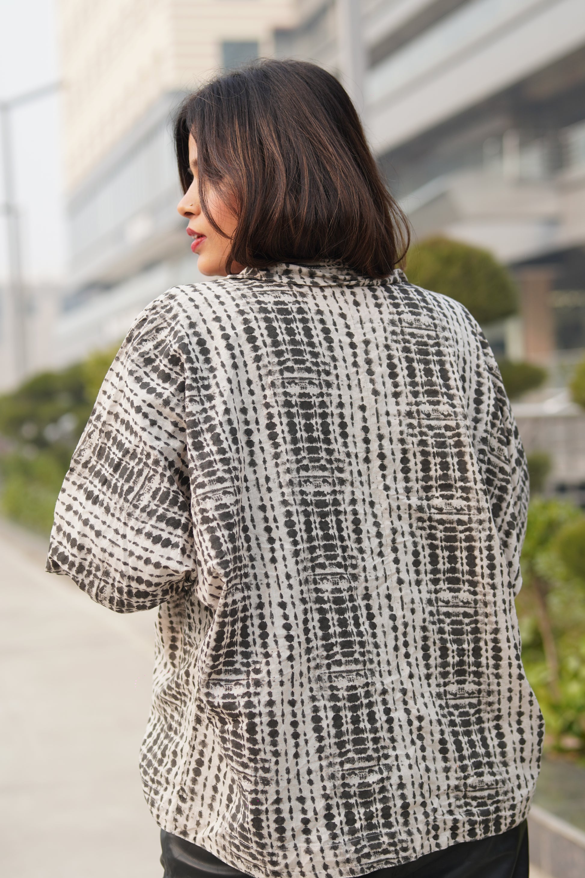 Thoughtful contrast patterns on the collar and pockets add a subtle design highlight while keeping the look minimal and versatile. Easy to style and perfect for everyday wear.