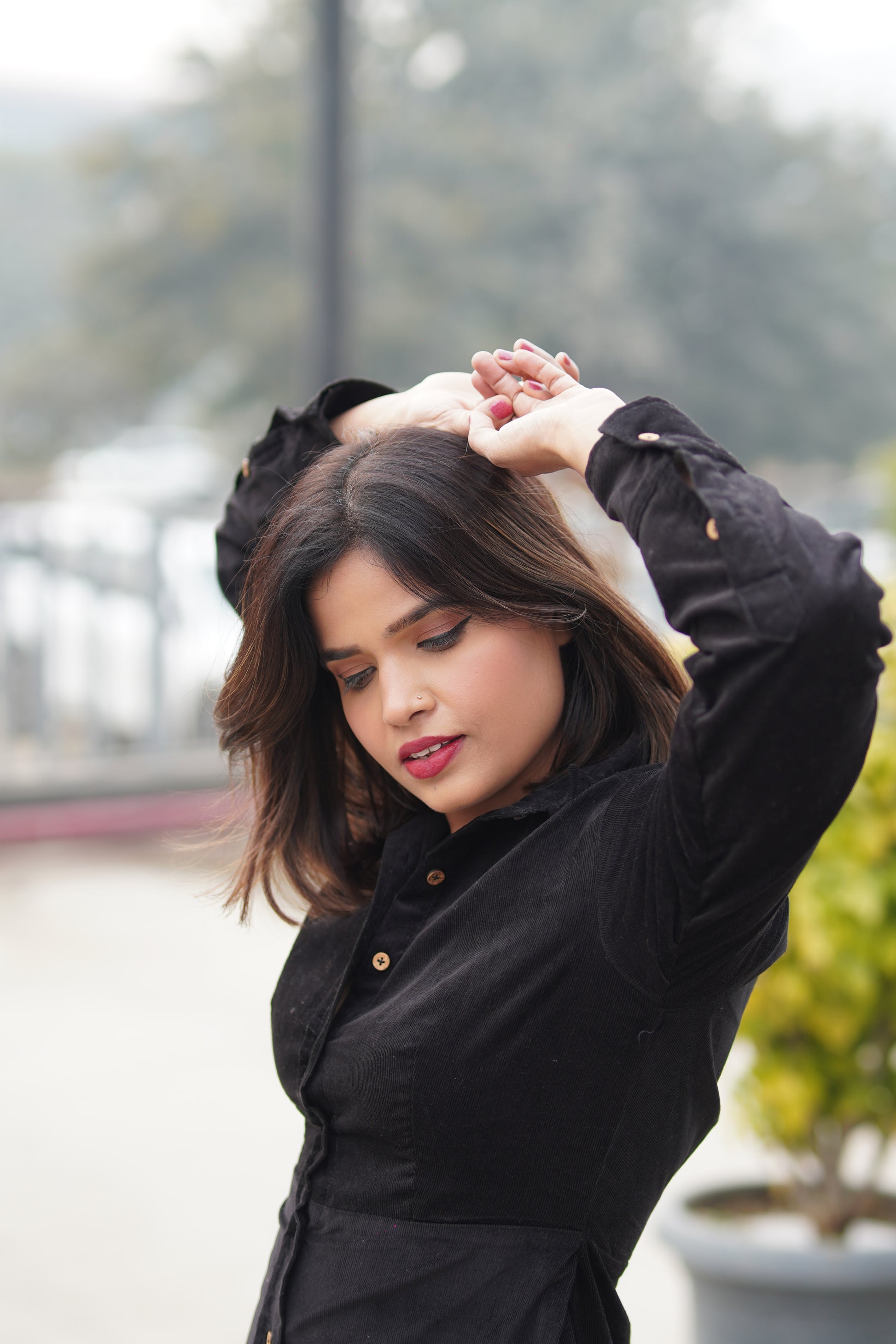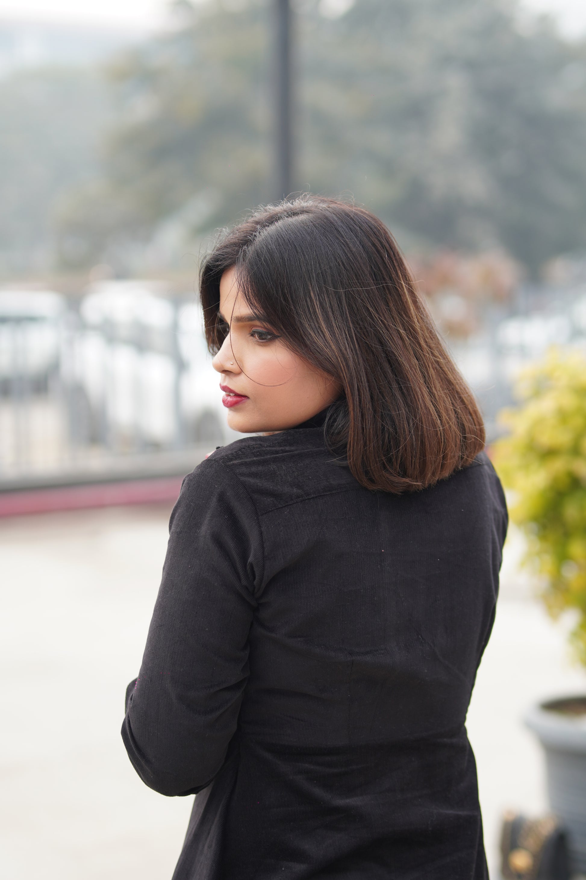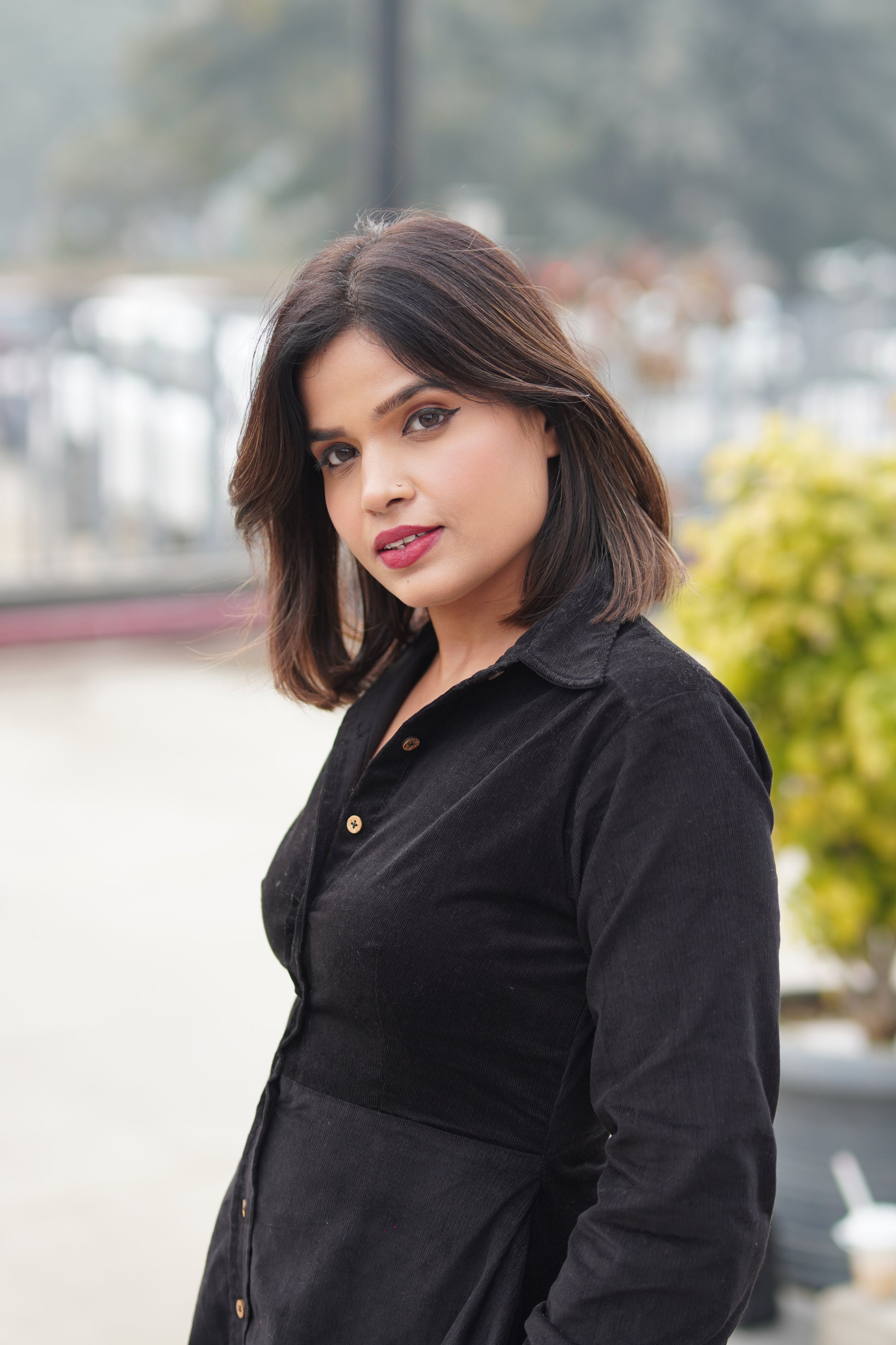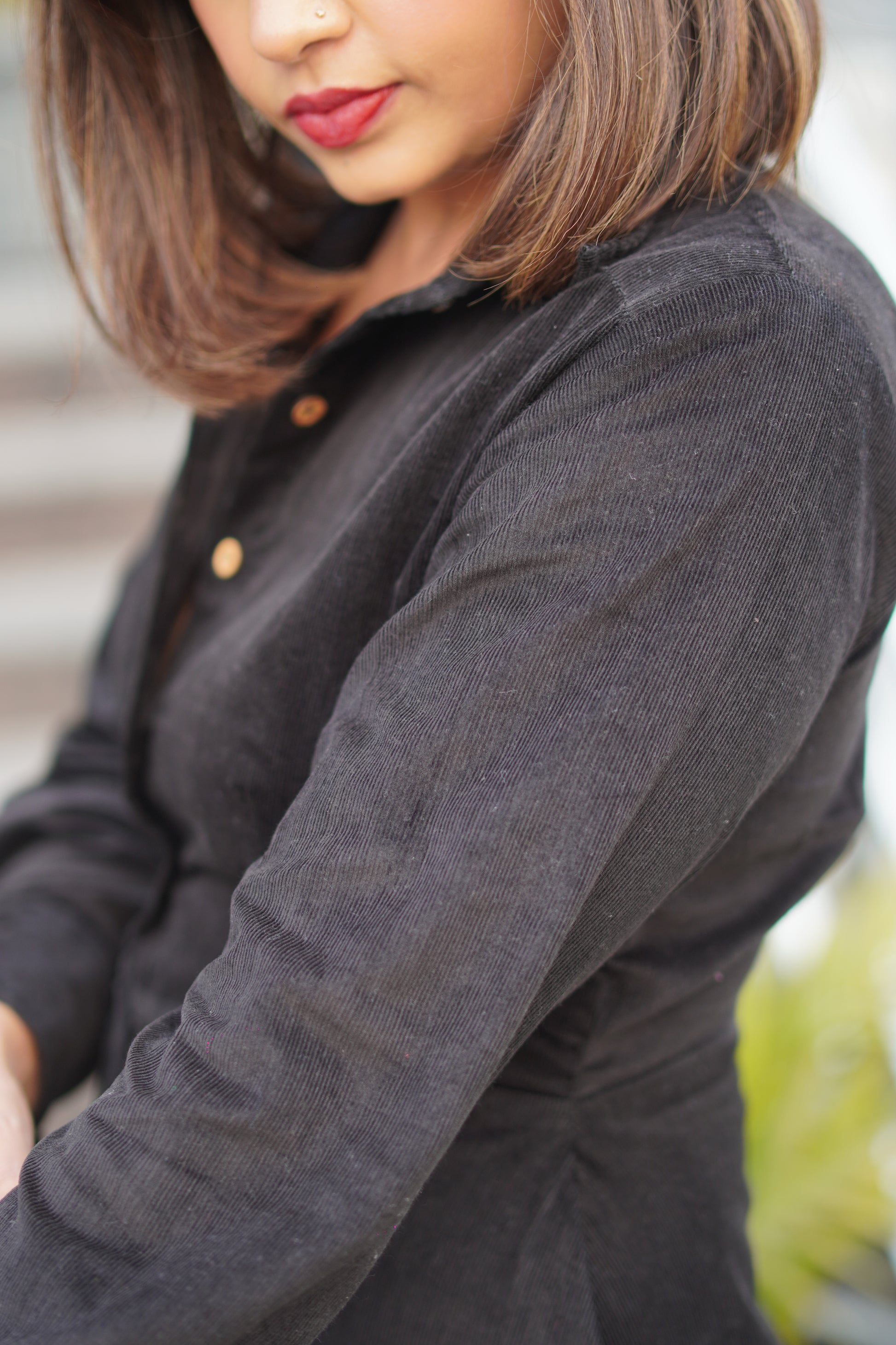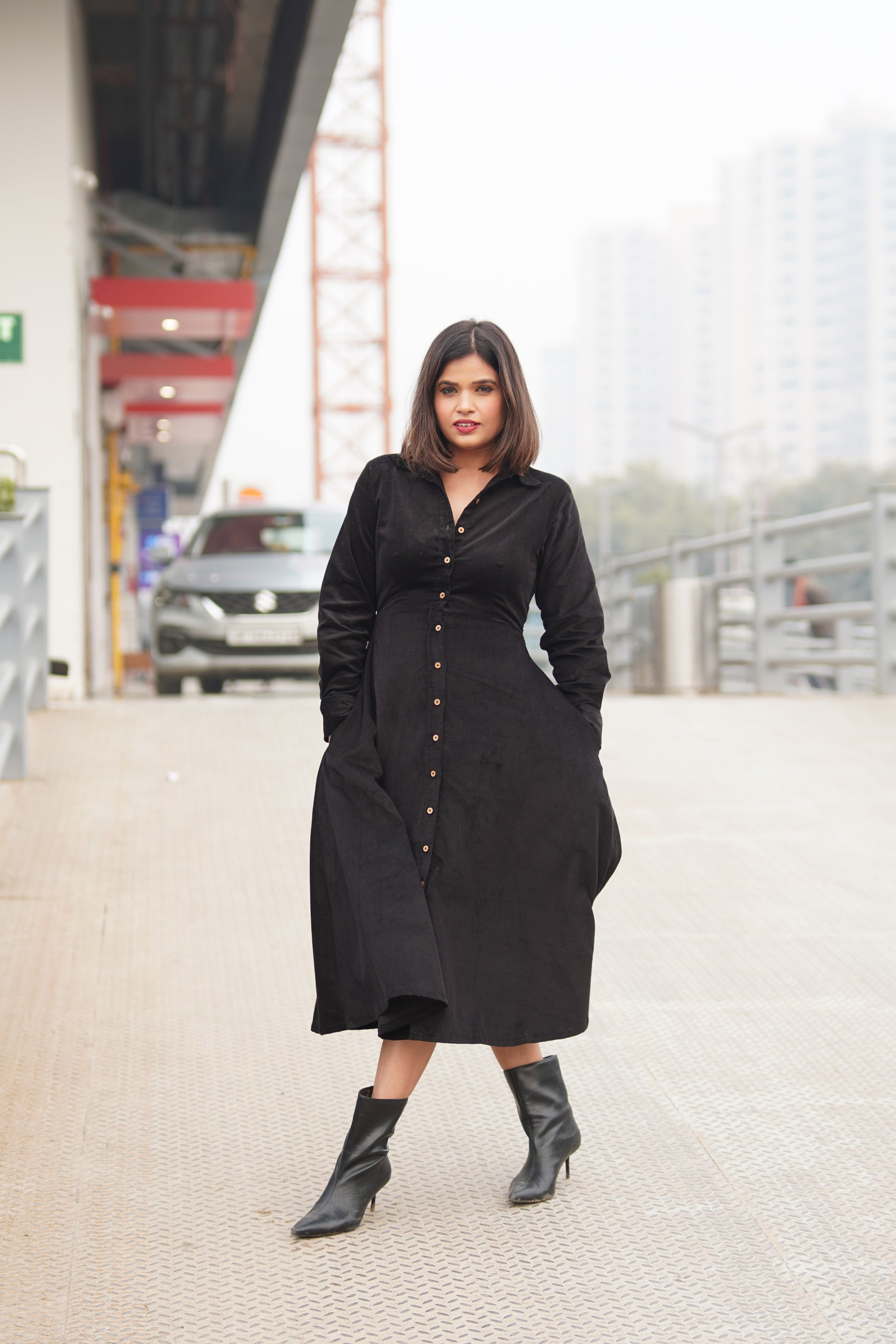 Crafted in premium black corduroy, this dress is designed with a structured silhouette that offers a clean, flattering shape without compromising on comfort. Thoughtfully detailed with wooden buttons and practical pockets, it seamlessly blends style with functionality.