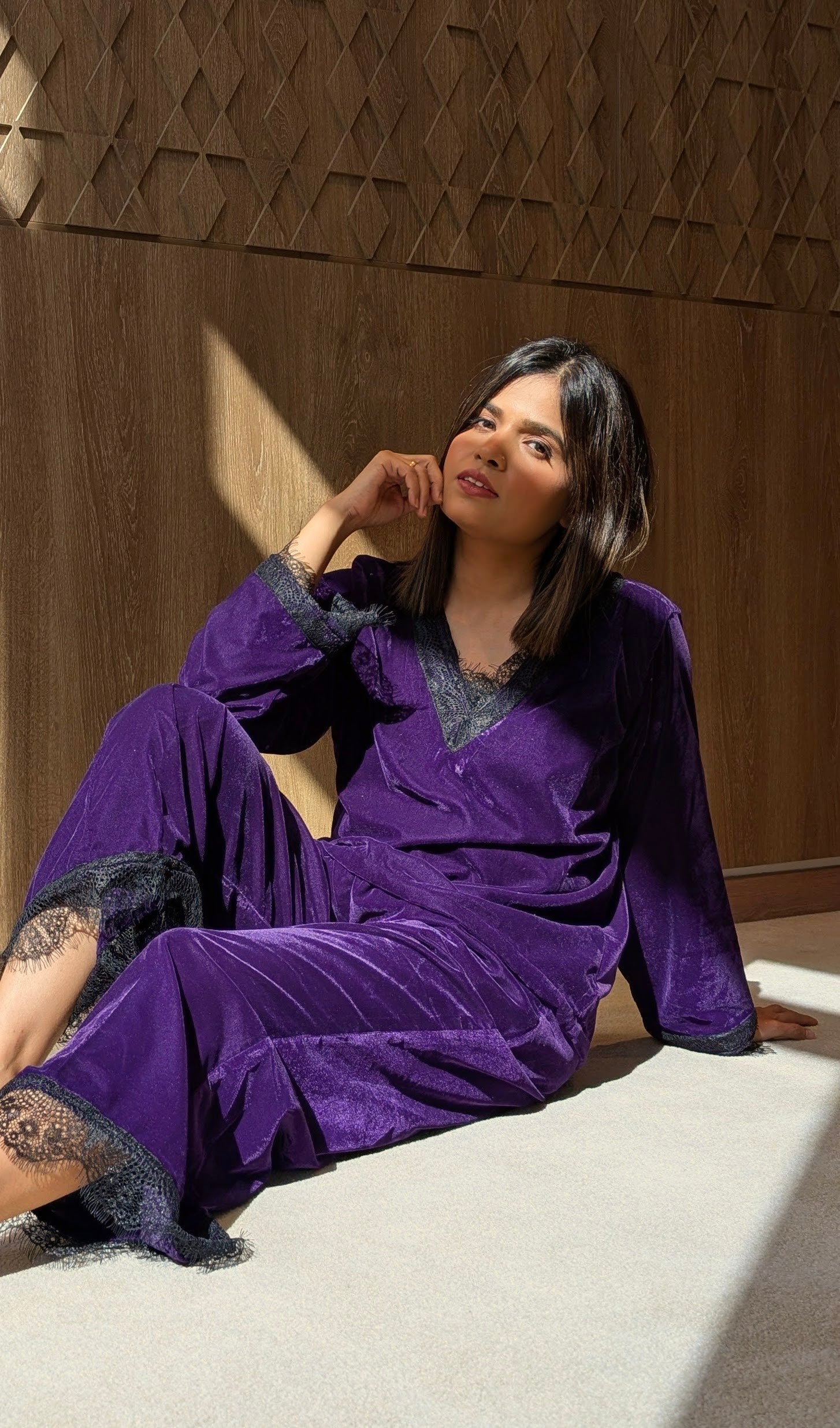 The rich, royal hue paired with delicate lace detailing adds a graceful, feminine charm, while the relaxed silhouette ensures you stay effortlessly comfortable. With thoughtfully designed pocket pants for everyday ease, Velvet Dream brings together style, softness, and sophistication in one cozy set.